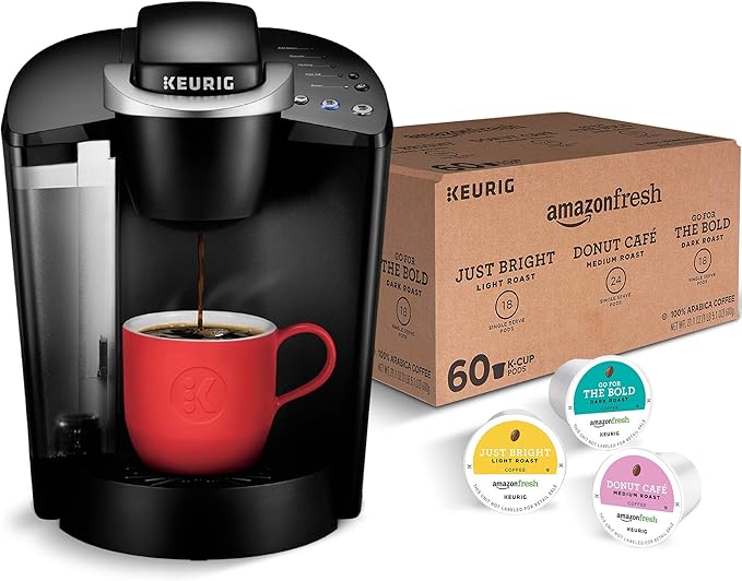⭐ Included Coffee: 60-count AmazonFresh K-Cup Variety Pack with light, medium, and dark coffee roasts.